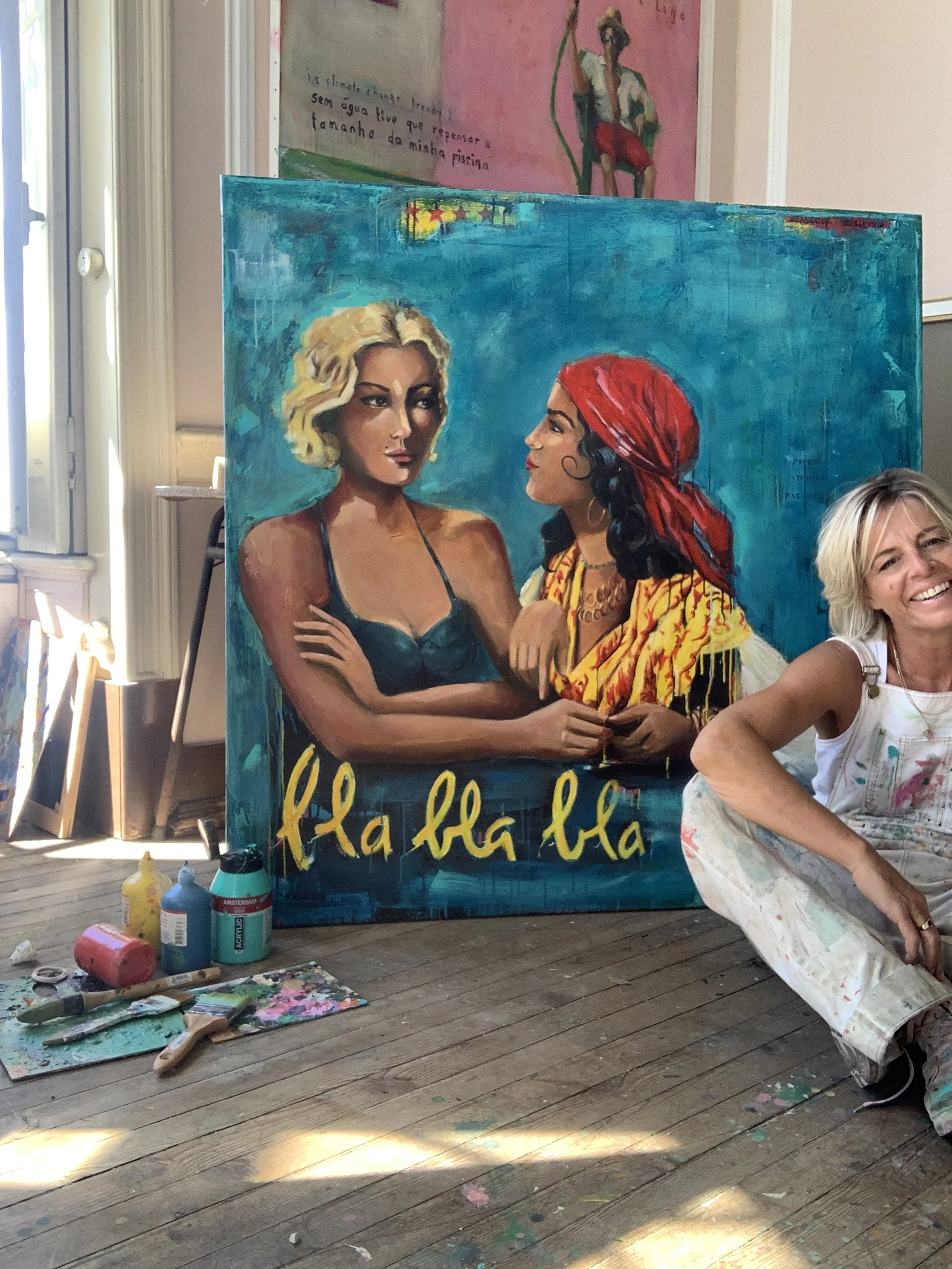 De Lorme is a committed artist. Her contemporary figurative style conveys a narrative that aims to shake up and provoke confrontational reflection, in the face of the absurdity of our current world. Her large canvases are not only joyfully tangy and feminine, they ironically reflect the issues of our time, transmitting a powerful social, political or moral message. She questions inequalities, overconsumption, greenwashing, sexism or patriarchy. The acrylic colors are saturated, her rapid and bold brushstrokes cover some collages erased by the layers of paint. These very current compositions whisper to us the struggles but also the hopes of our time. A duality between an aesthetic work and a reflection.